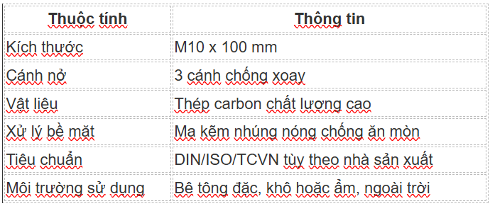 3. Thông số kỹ thuật Bulong nở mạ nhúng nóng M10x100