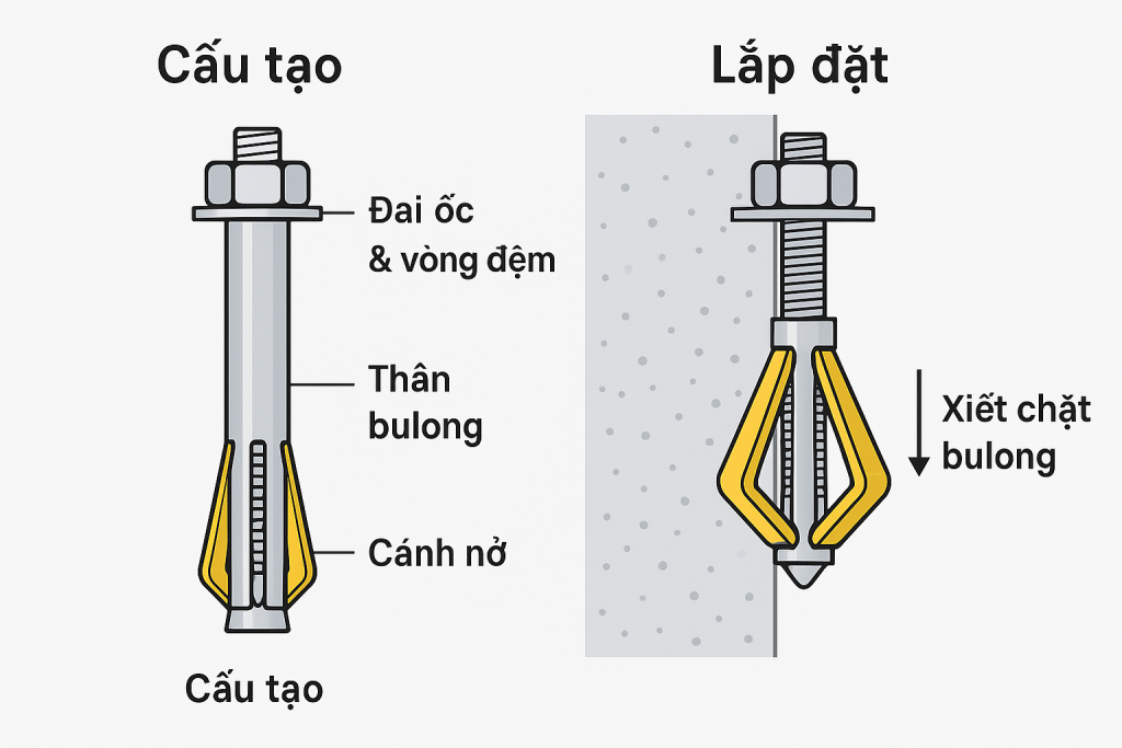 Cấu tạo: Thân bulong, đai ốc, vòng đệm, bộ 3 cánh nở